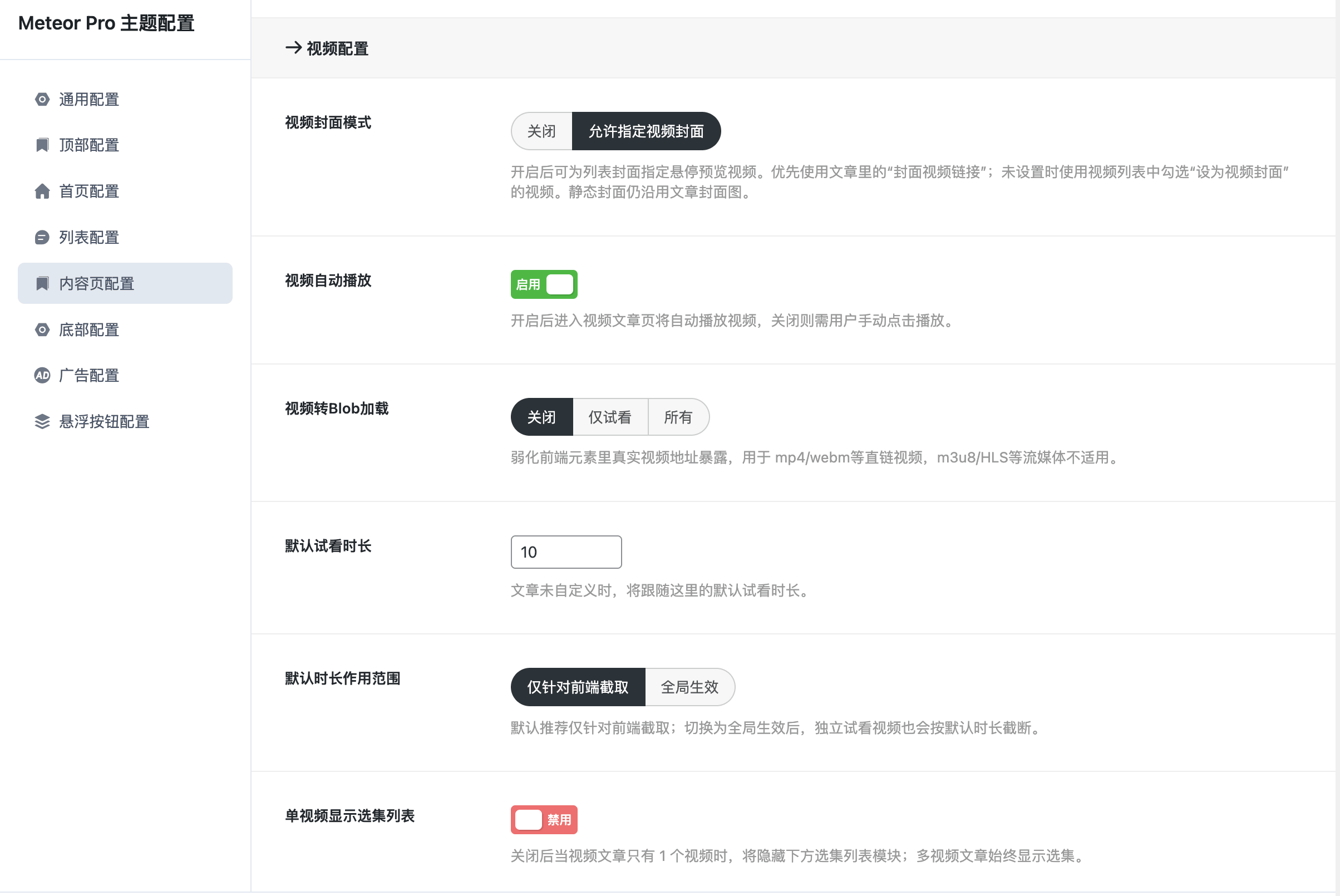 - 主题配置 -> 内容页配置 -> 视频配置:用于设置全局规则,例如视频封面模式、视频自动播放、视频转 Blob 加载、默认试看时长和选集标题等。